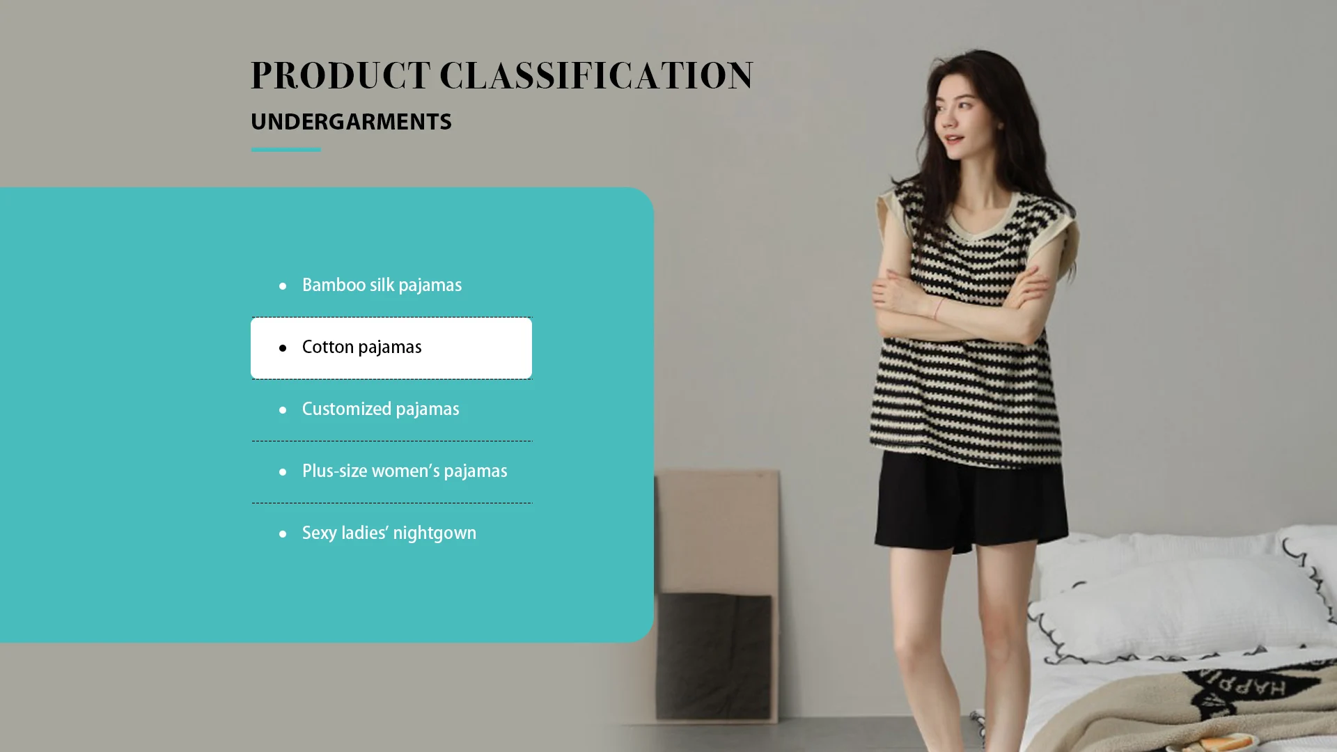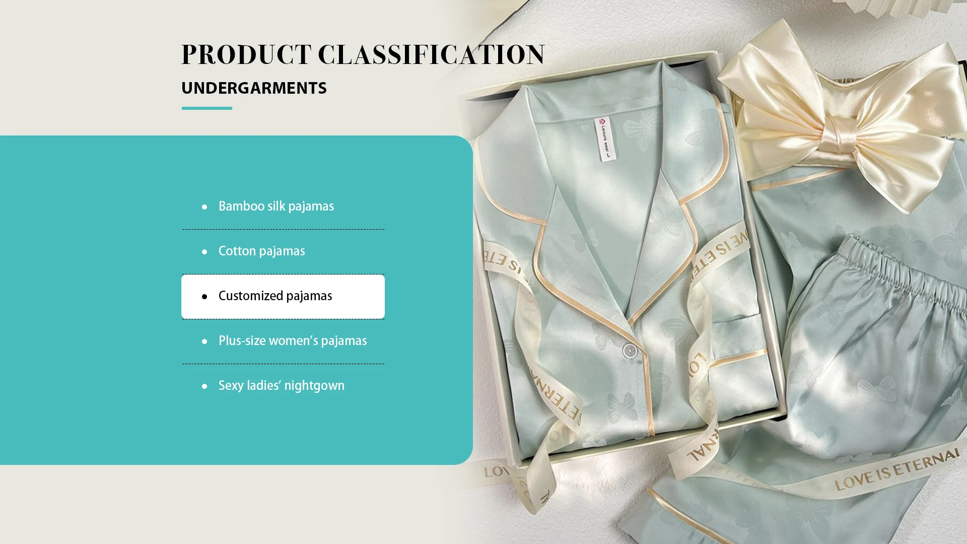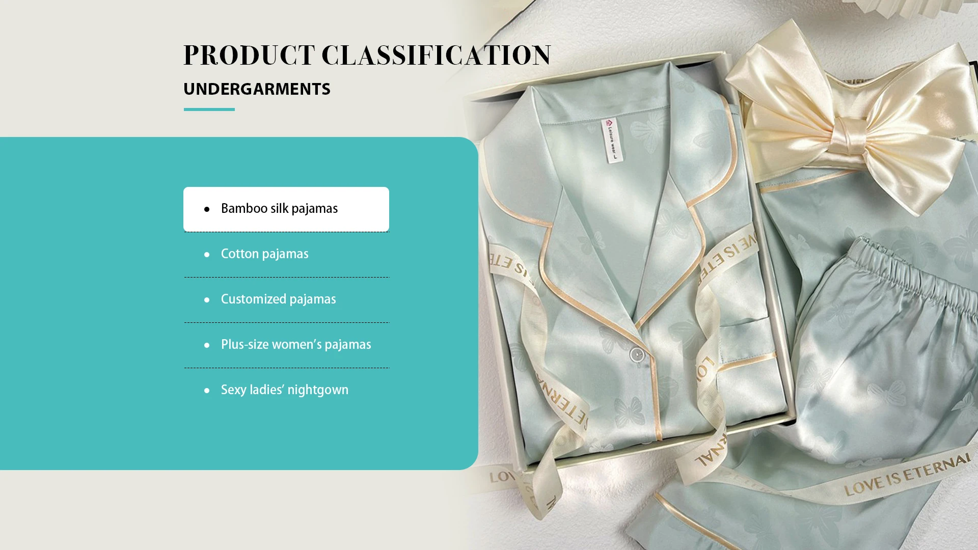 Productos principales:Pijamas de seda de bambú, pijamas de mujer de talla grande, camisón de mujer sexy, pijamas personalizados, pijamas de mujer de talla grande